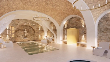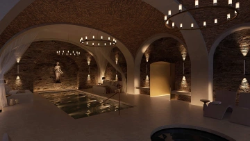 zasazený do historických kamenných zdí a kleneb nabízí jedinečný zážitek klidu a ticha. Ušlechtilá krása starého zdiva vytváří harmonickou kulisu, v níž se voda stává přirozeným prvkem odpočinku. Tlumené světlo podtrhuje intimní atmosféru prostoru a zve k pomalému, ničím nerušenému uvolnění. Každý pohyb ve vodě zde splývá s historií místa a pocitem hluboké relaxace.