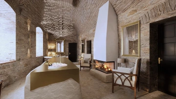 Vstupte do komnaty odpočinku, kde hřejivý krb, pohodlná křesla a elegantní bar vytvářejí prostor k tichému odpočinku a noblesnímu posezení. Světlo plamenů odráží sofistikované detaily interiéru a dotváří intimní, klidnou atmosféru. Zde můžete načerpat energii, vychutnat si osvěžující nápoj a nechat se unést chvílemi čistého klidu v zámeckém prostředí. Tento prostor je ideálním spojením pohodlí, elegance a komfortu pro všechny smysly.
